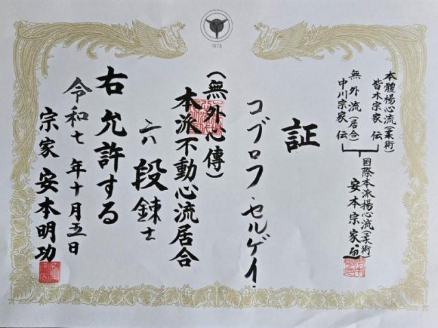 Шихану С.В. Коблову присвоены 6 дан Мото-Ха Мугай-Рю Фудошин Иай и титул Ренши.